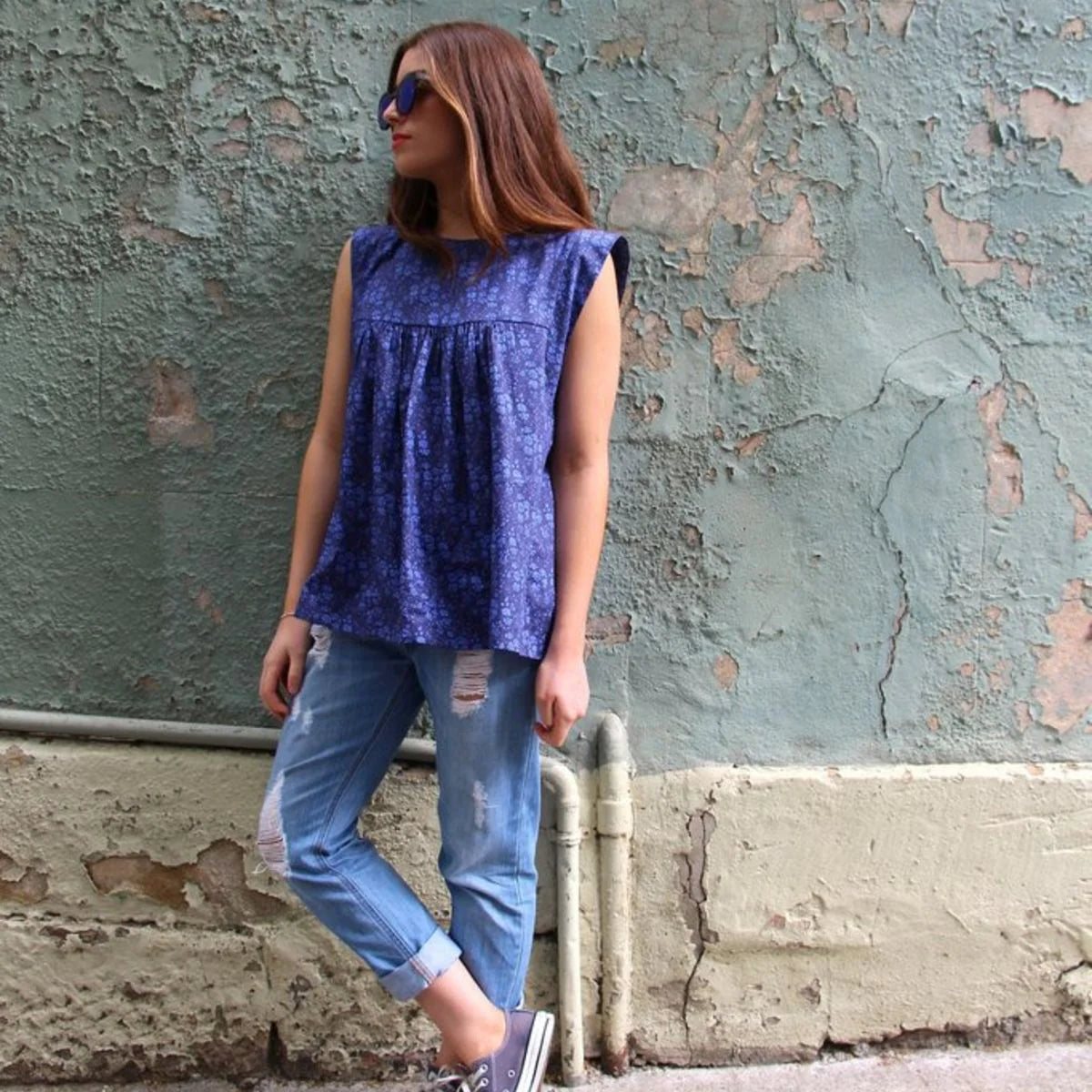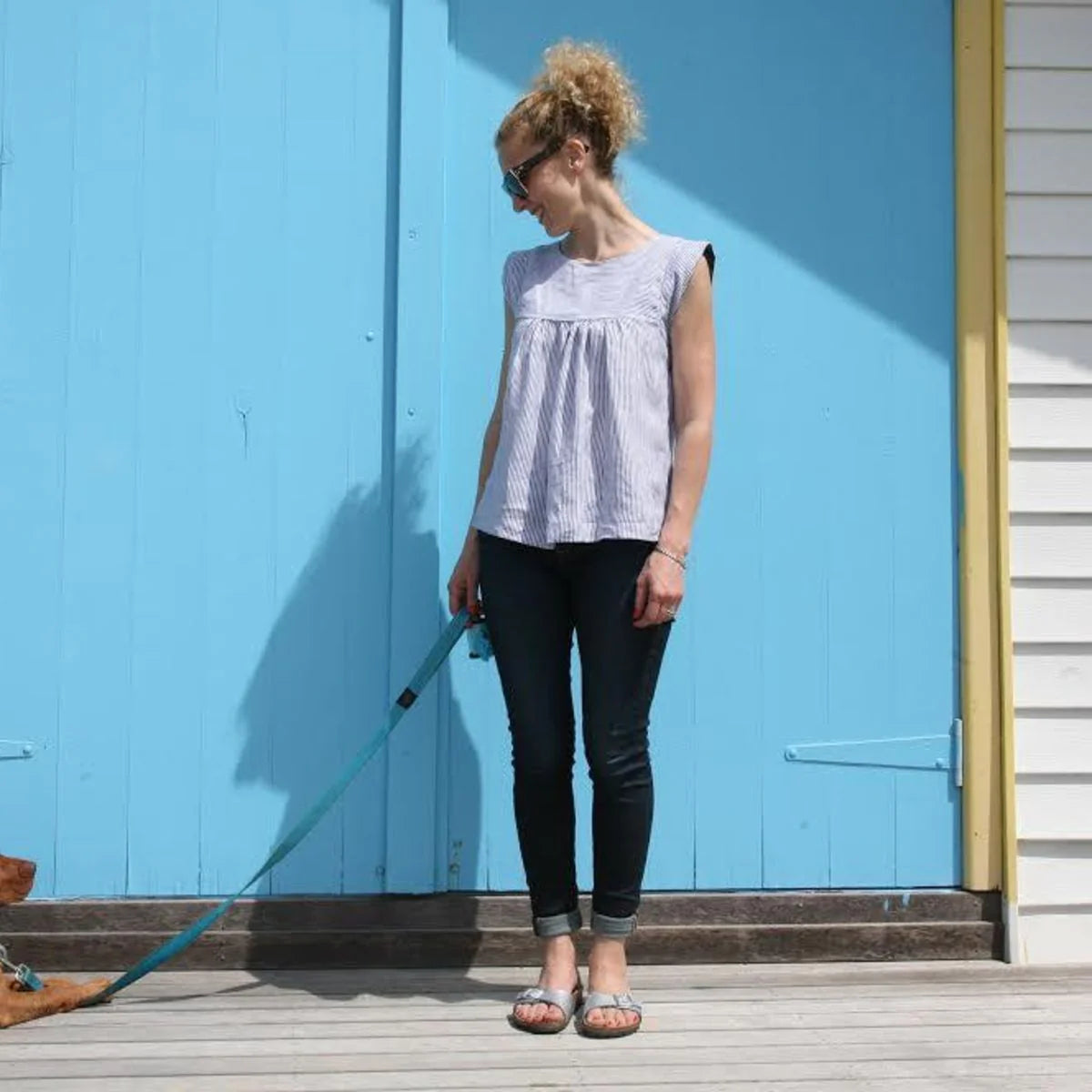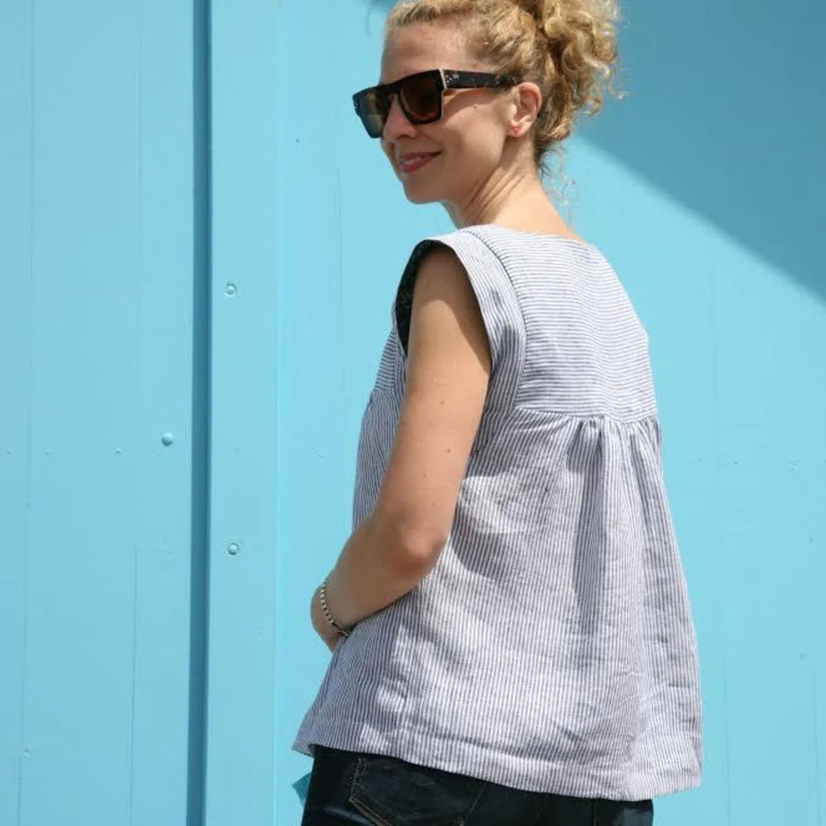The Alice Top & Dress is a smock style that features a self-lined yoke bodice with shaped armhole bands and a softly gathered body on front and back. The dress version includes side pockets.