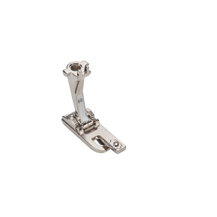 A scroll on the foot feeds the fabric edge from the front and turns it under twice, all in one operation. This produces a narrow, sturdy hem, which in combination with the corresponding stitch type creates the popular scalloped (or shell) hem. Roll and Shell Hemmer #68 is equipped with a 2 mm wide guide.