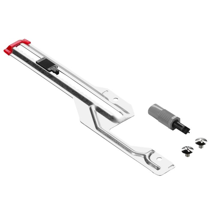 The attachment is screwed to the freearm. The center of rotation can be either to the right or left of the needle, with the attaching screw lying flat enough to allow the fabric to feed smoothly over it. A diameter of between 1 inch and 5-5/16 inches (2.5 cm and 13.5 cm) can be set on the slide.