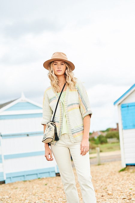 These easy knit cardigans showcase a variety of edgings. We have a 1x1 rib for the welts, 2x2 rib for the border and garter stitch for the cuffs- a great way to make a statement with a classic design. And both are right on trend for this Spring/Summer.