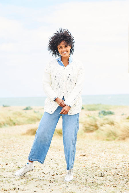 This pattern features a sweater and cardigan with a twist! Each garment has a beautiful eyelet design. The sweater has a roll neck and is knitted on 6mm and 7mm needles. The cardigan has a round neck and is knitted on 7mm needles.