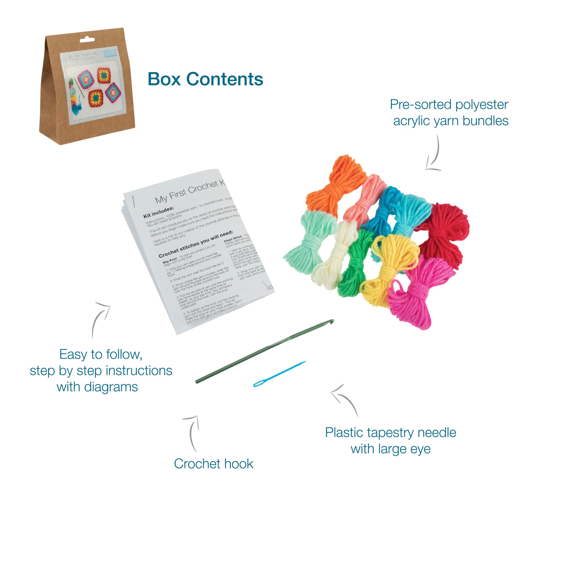 This kit contains everything you need to start crocheting. Simple to create crochet squares, perfect for little hands.